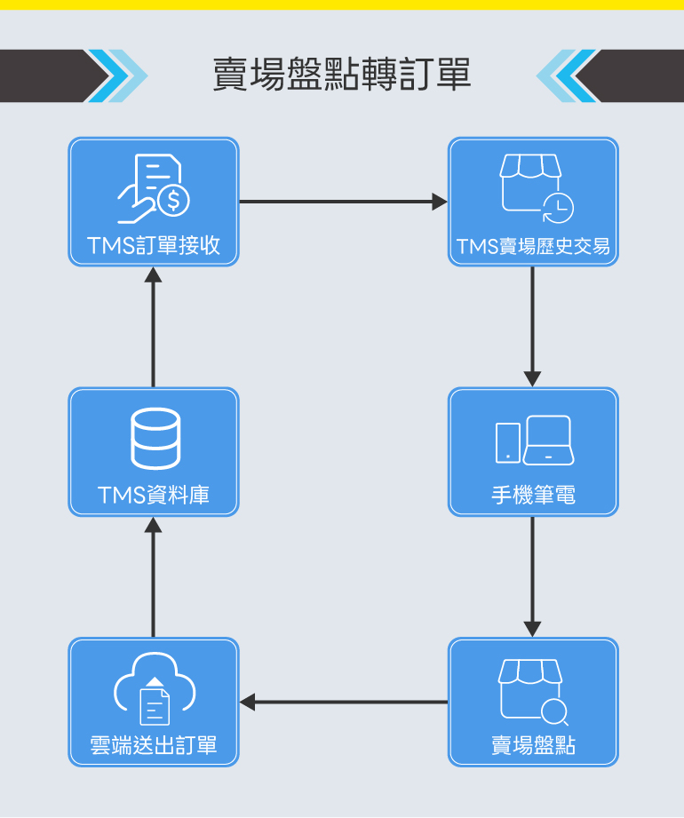 利用平板或NB至賣場或客戶處盤商品後,直接上傳訂單至TMS進銷存訂單系統。