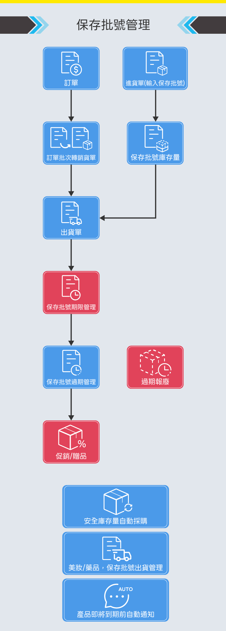 提供生產、進貨、銷售、保存批號庫存管理,適用食品、藥品、美妝行業