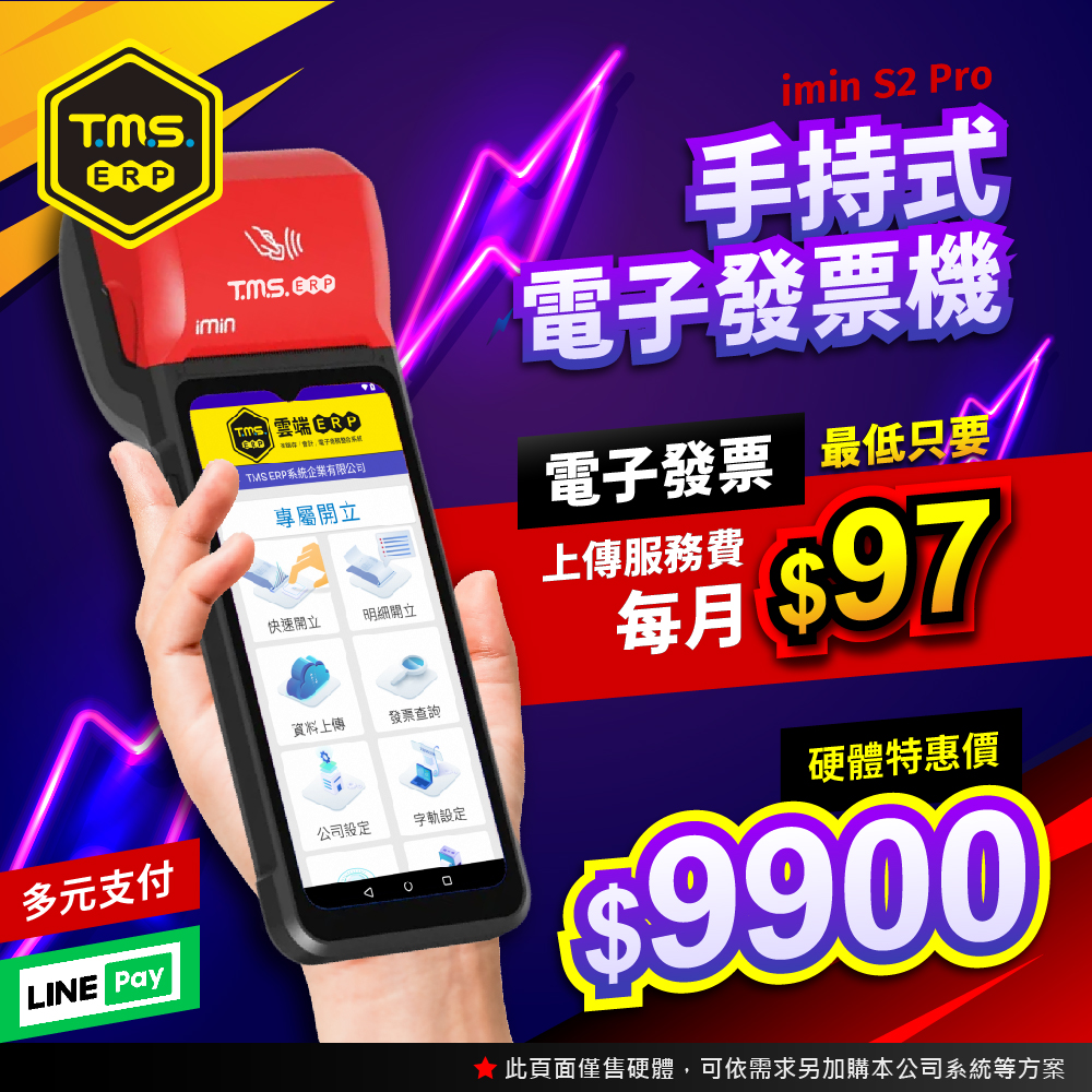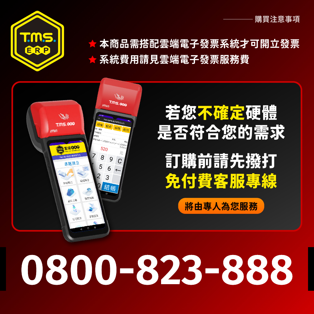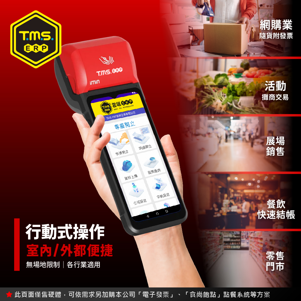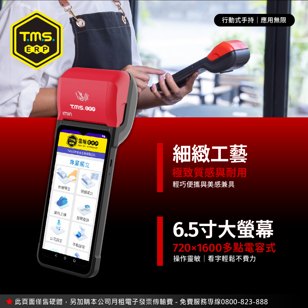 TMS ERP 手持式電子發票機一機多用,線上或離線開立電子發票、手機載具,可多元支付當收款機,可當簡易 POS 結帳用,開啟發票輸入頁面,輸入金額即完成開立發票,真的只要二秒鐘。