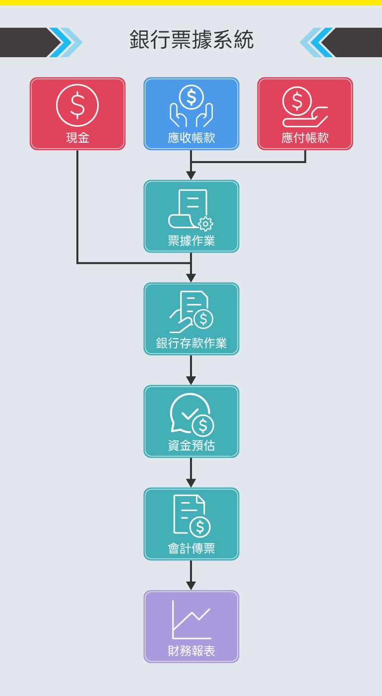 依使用者設定系統桌面,銀行票據完全串連TMS ERP其他相關系統及自動產生傳票。