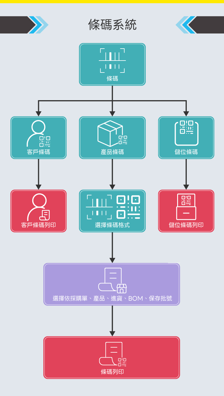 條碼需求可依產品、採購單、進貨單、BOM..等依單據數量快速列印條碼