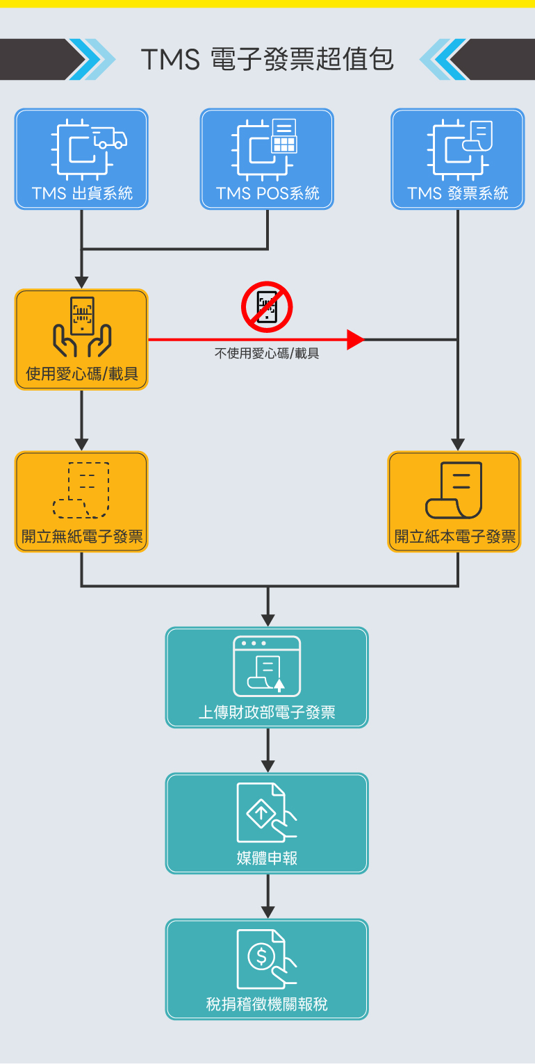 TMS ERP完整提供進銷存整合電子發票、列印、載具、加值中心服務。6種電子發票套餐完全解決市場需求,提供原系統串接或匯入開立電子發票,解決電商平台、展場開立電子發票需求。開立自動上傳財政部電子發票中心及開立電子發票通知。