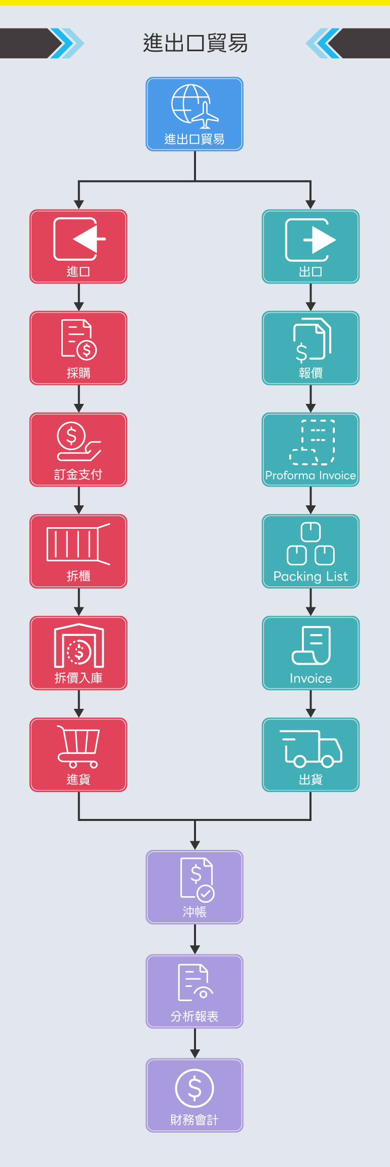 支援多幣值單據輸入及沖帳,快速建立P/I、Packing List、Invoice表單,進口拆價自動化計算及成本分攤,,完整訂金支出進銷存貿易系統。