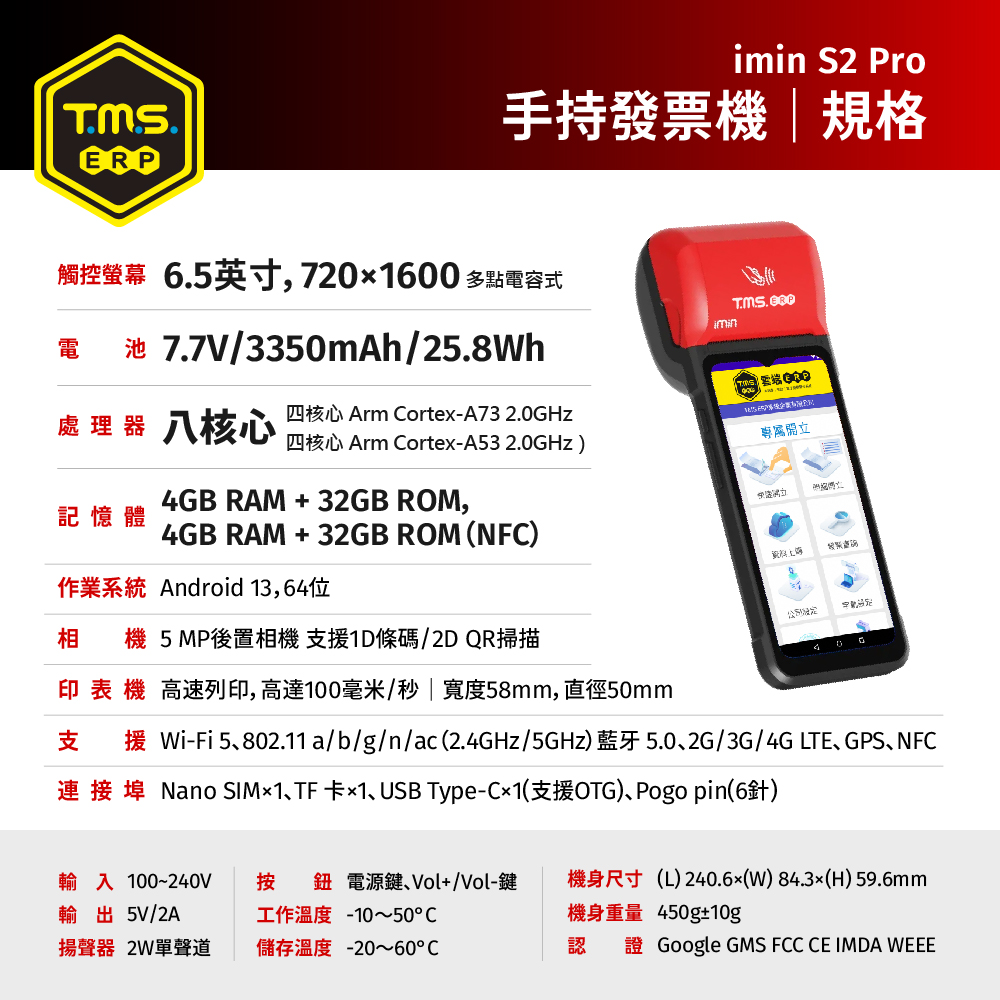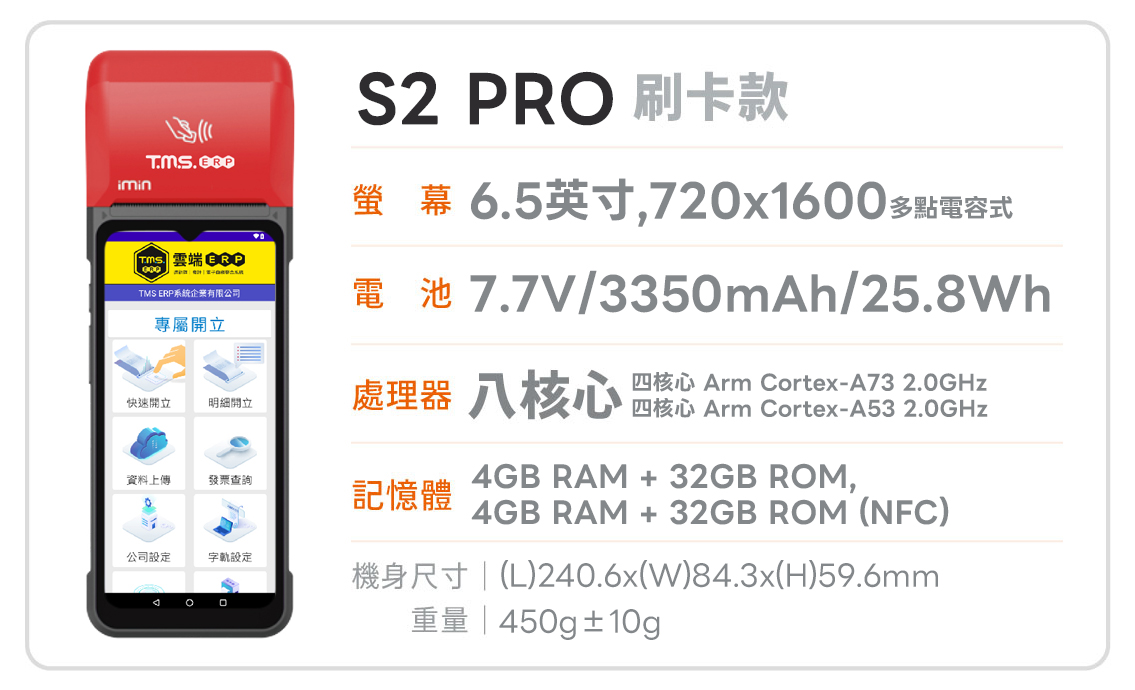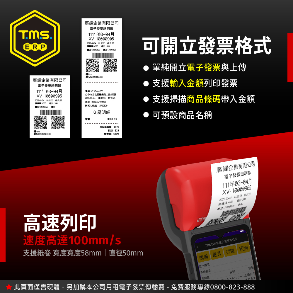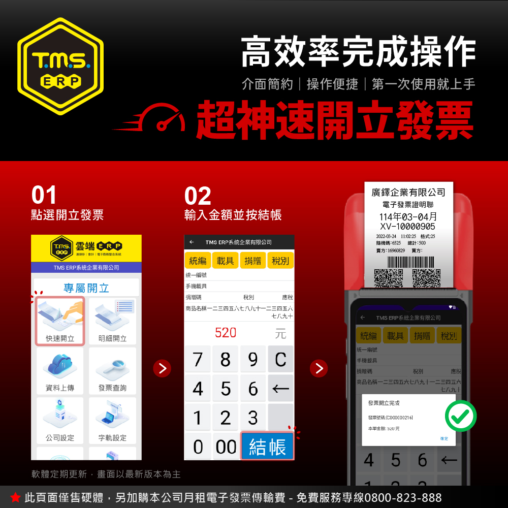TMS ERP 手持式電子發票機一機多用,線上或離線開立電子發票、手機載具,可多元支付當收款機,可當簡易 POS 結帳用,開啟發票輸入頁面,輸入金額即完成開立發票,真的只要二秒鐘。