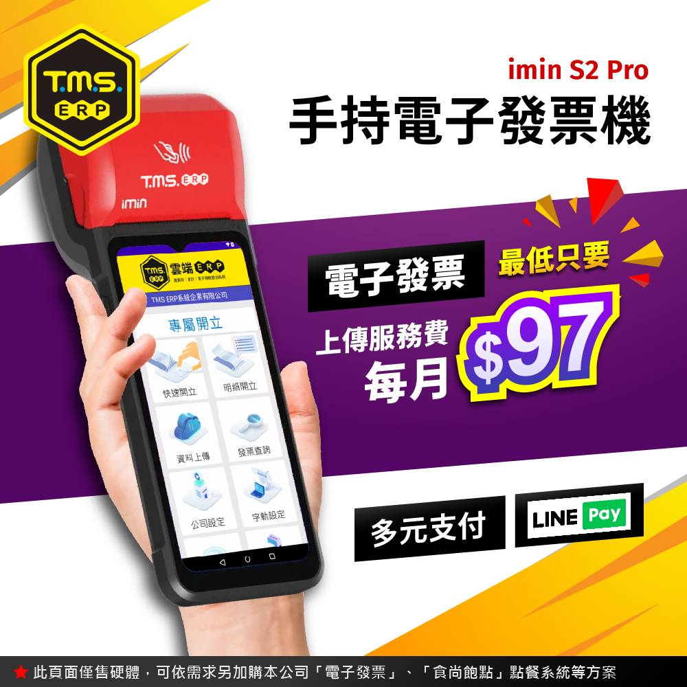 TMS ERP 手持式電子發票機一機多用,線上或離線開立電子發票、手機載具,可多元支付當收款機,可當簡易 POS 結帳用,開啟發票輸入頁面,輸入金額即完成開立發票,真的只要二秒鐘。